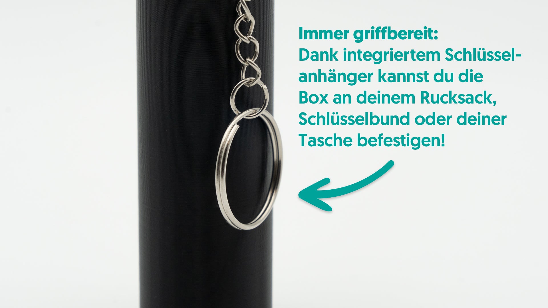 - Perfekt für unterwegs: Mit integriertem Schlüsselanhänger, sodass du die Box einfach an deinem Rucksack, Schlüsselbund oder Tasche befestigen kannst.